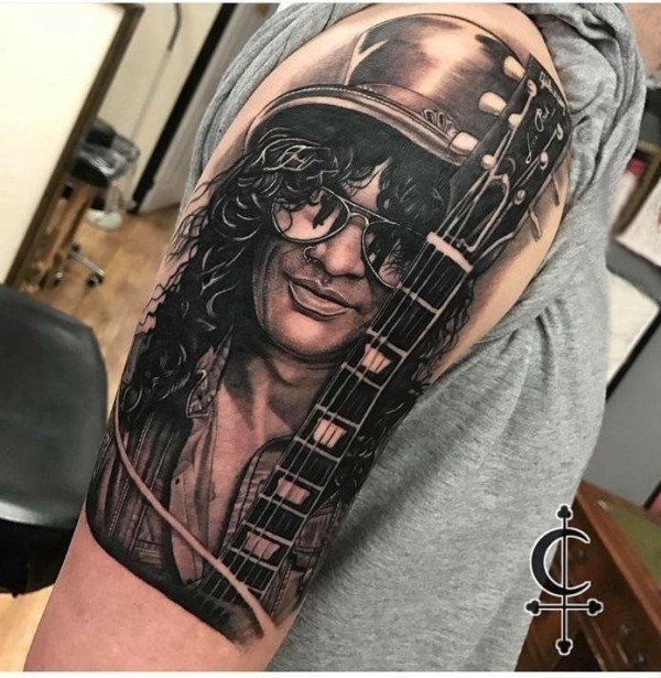 男生手臂上黑灰素描点刺技巧创意摇滚肖像纹身图片