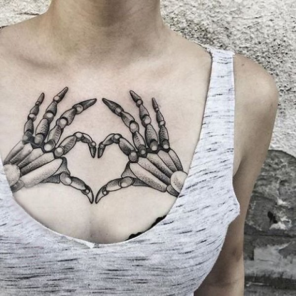 女生锁骨下黑灰素描点刺技巧创意比心纹身图片