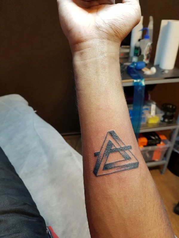 男生手臂上黑灰素描点刺技巧创意几何纹身图片