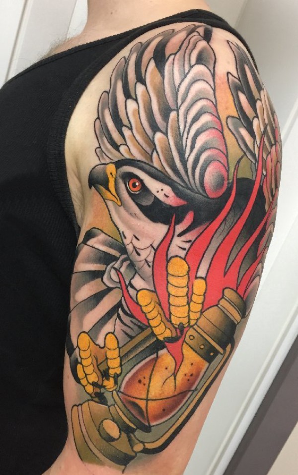 男生手臂上彩绘水彩素描霸气老鹰纹身图片