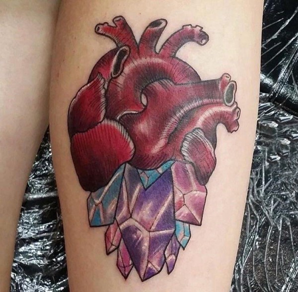 男生手臂上彩绘渐变几何简单线条晶石和心脏纹身图片