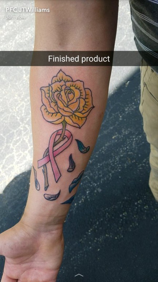 男生手臂上彩绘渐变简单线条植物花朵和丝带纹身图片