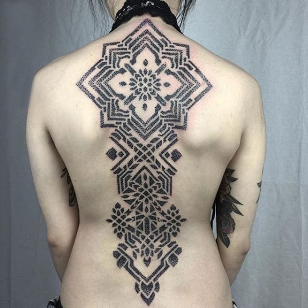 女生后腰纹身黑白灰风格抽象线条纹身图案