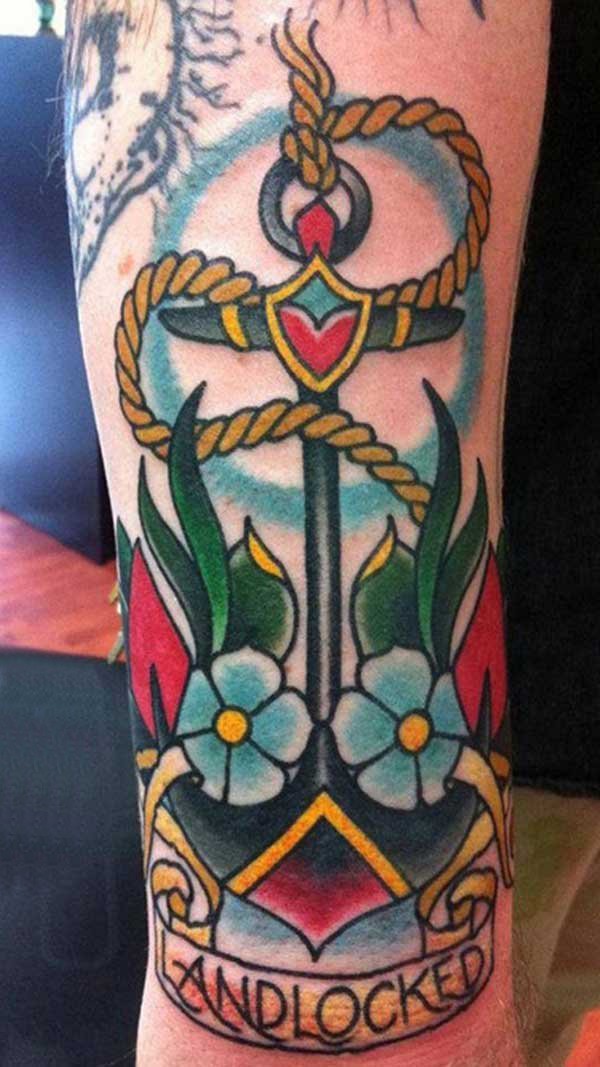 男生手臂上彩绘水彩素描创意文艺花朵船锚纹身图片