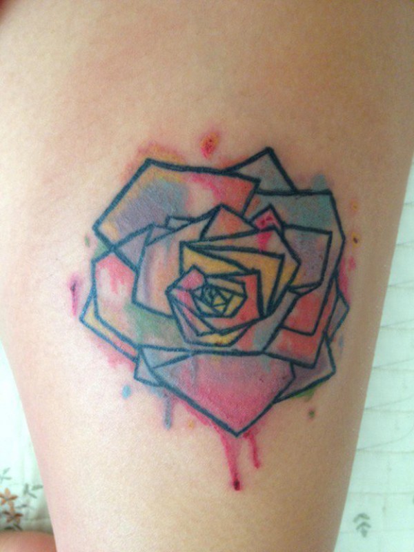 女生大腿上彩绘泼墨简单线条植物几何花朵纹身图片
