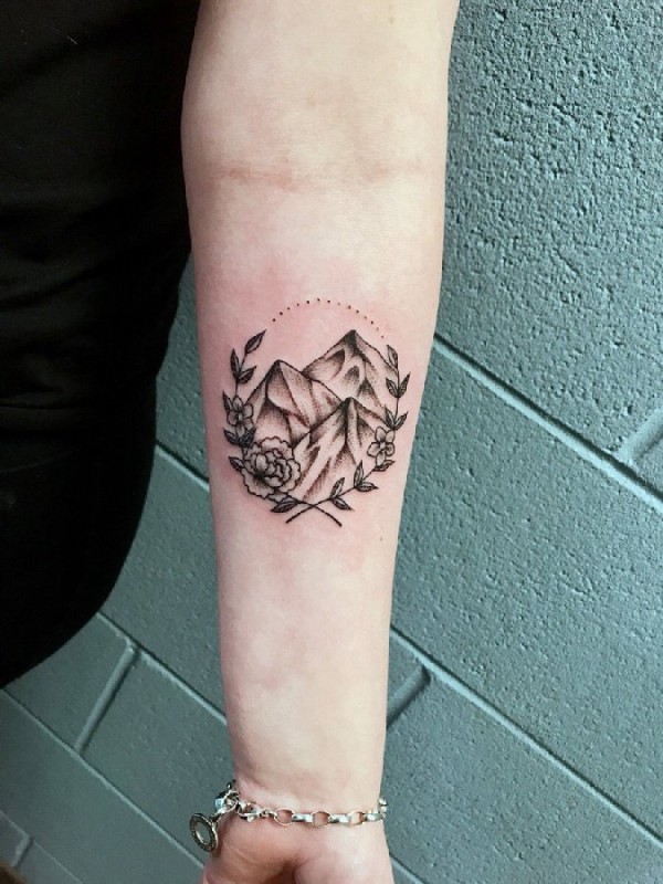 女生手臂上黑灰素描点刺技巧创意山峰花朵纹身图片