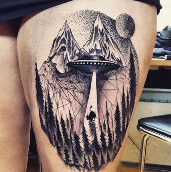 多款黑色线条素描创意有趣宇宙飞碟纹身图案