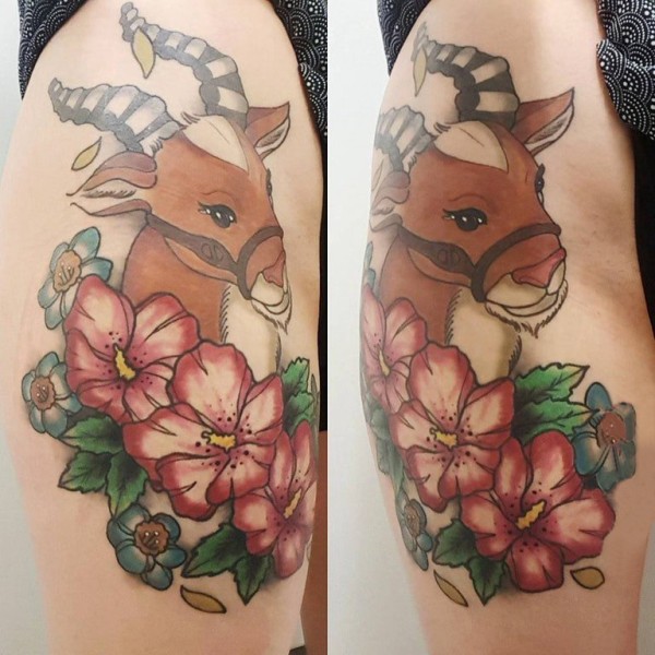 女生大腿上彩绘渐变简单线条植物花朵和小动物鹿纹身图片