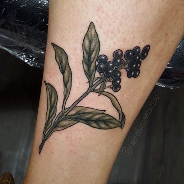 男生小腿上彩绘渐变简单线条植物叶子和果实纹身图片