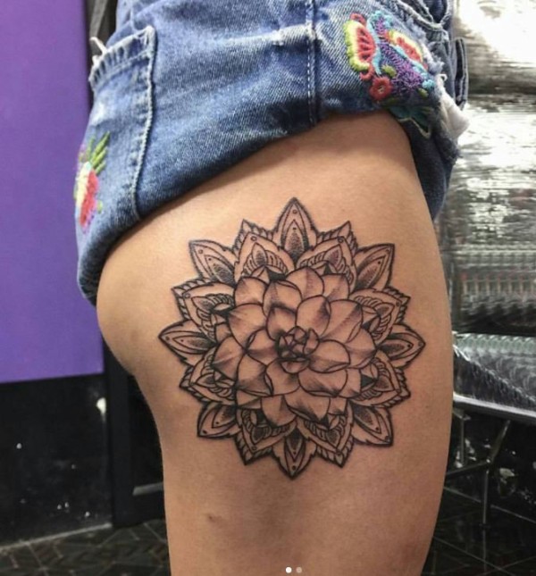 女生臀部黑色点刺简单线条植物花朵纹身图片