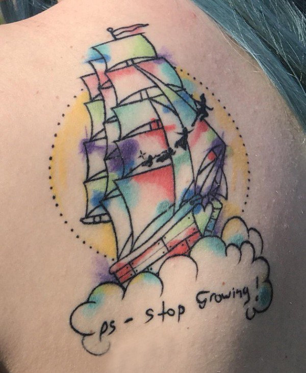 女生后肩上彩绘泼墨几何简单线条英文和帆船纹身图片