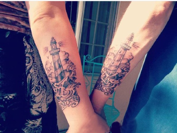 情侣手臂上黑灰点刺简单抽象线条浪花和灯塔纹身图片