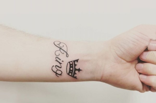 女生手腕上黑色线条文艺花体英文皇冠纹身图片