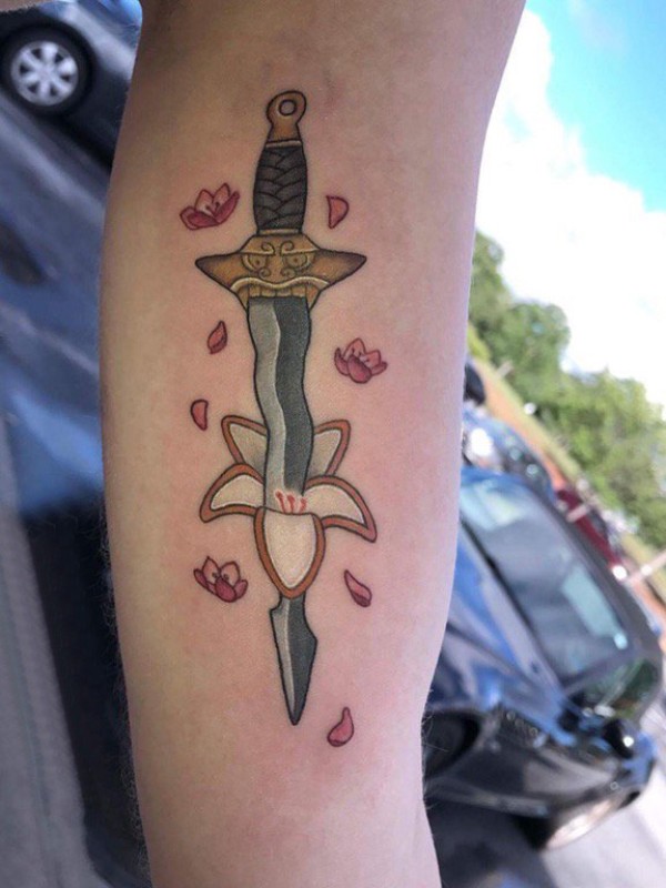 女生手臂上彩绘简单线条植物花朵和匕首纹身图片