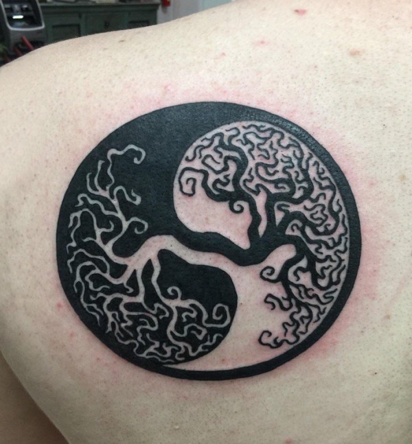 女生后肩上黑色几何简单线条创意植物树阴阳八卦纹身图片