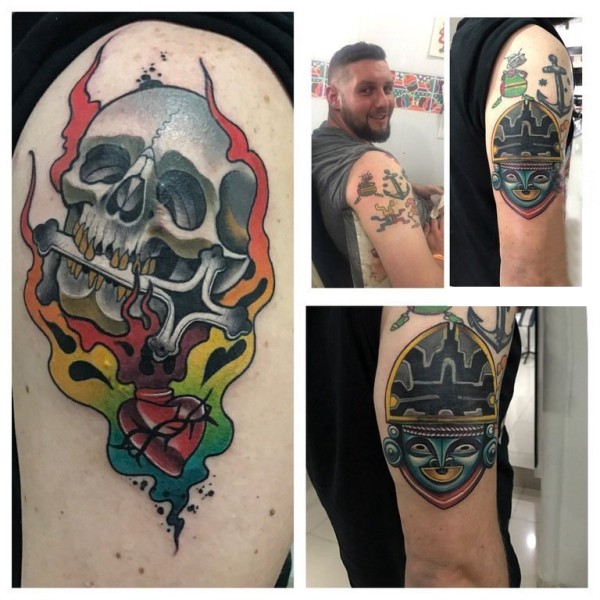 男生手臂上彩绘水彩素描创意恐怖骷髅霸气纹身图片