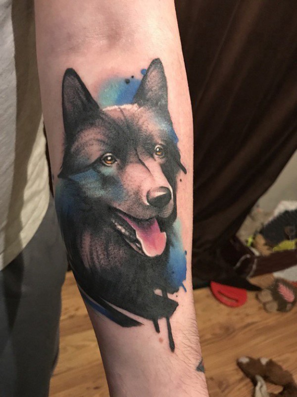 男生手臂上彩绘水彩简单线条小动物狗纹身图片