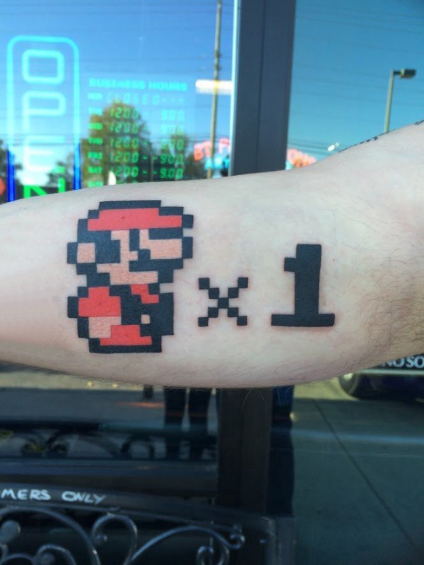 男生手臂上彩绘几何简单线条卡通马里奥纹身图片