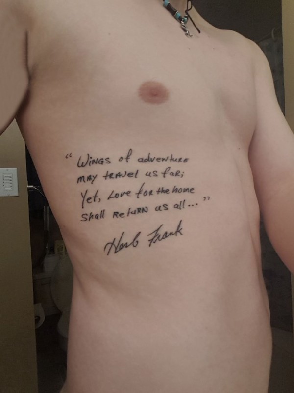 男生侧腰上黑色抽象线条有意义的英文短句纹身图片