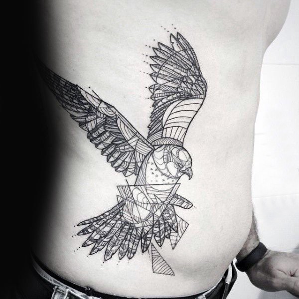 男生侧腰上黑色点刺几何简单线条小动物鸟纹身图片