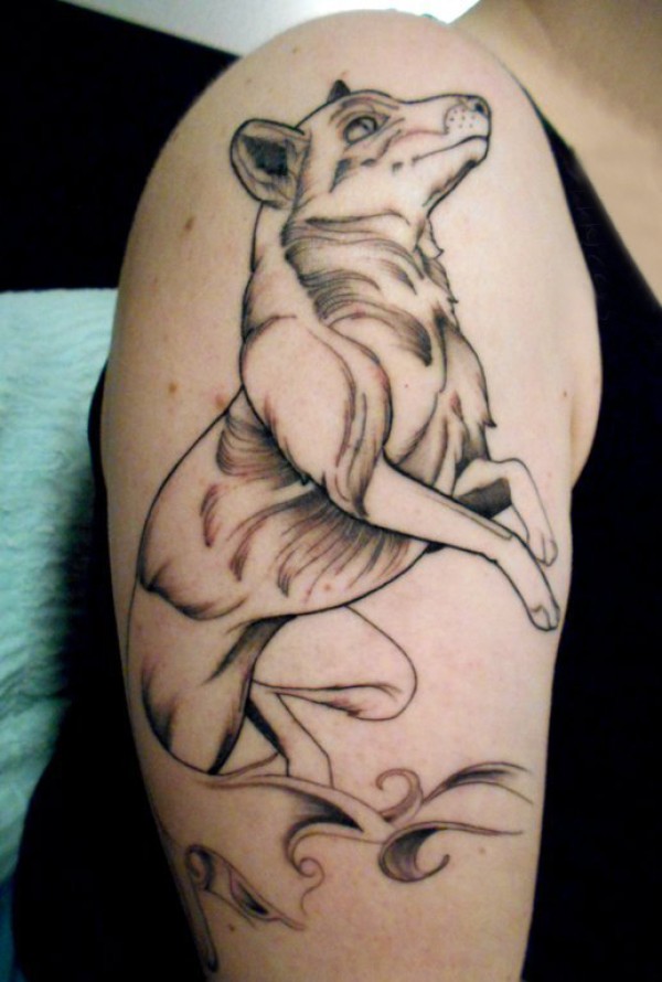 女生大腿上黑灰素描点刺技巧创意狗纹身图片