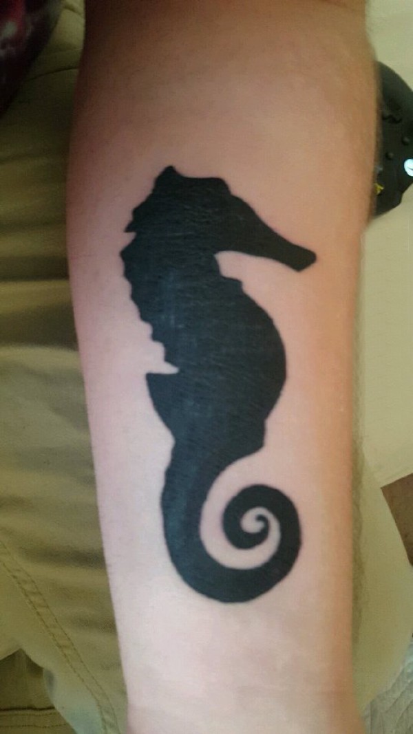 男生手臂上黑色简单线条小动物剪影海马纹身图片