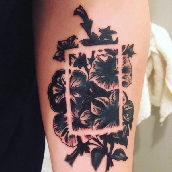 男生手臂上黑色点刺几何简单线条植物花朵纹身图片