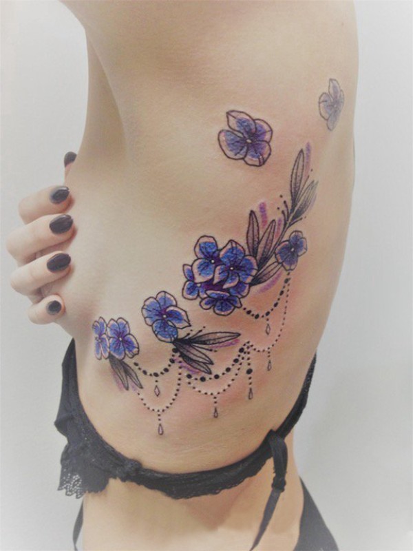 女生侧腰上彩绘渐变简单线条小清新植物花朵纹身图片