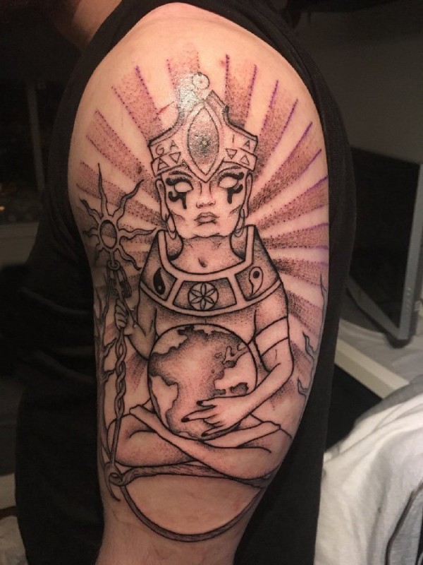 男生手臂上黑灰素描点刺技巧创意纹身图片