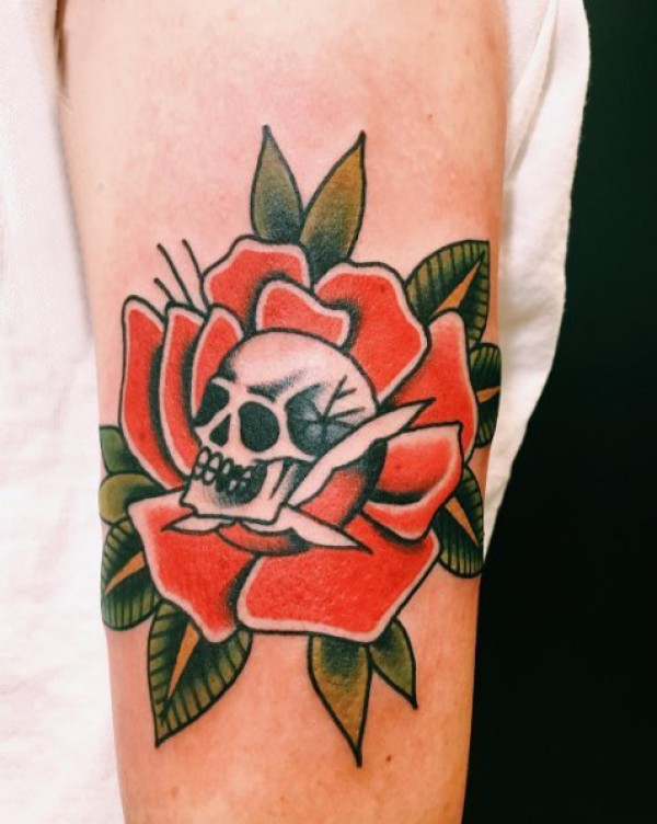 男生手臂上彩绘水彩素描创意唯美花朵恐怖骷髅纹身图片