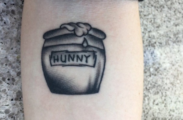 女生手臂上黑灰素描点刺技巧创意罐子纹身图片