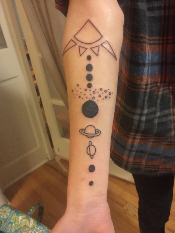 男生手臂上黑色线条素描创意星球元素纹身图片