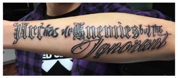 中国有嘻哈TT手臂上花体英文纹身图片