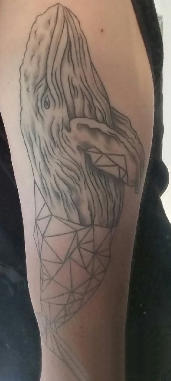 男生手臂上黑灰素描点刺技巧创意鲸纹身图片