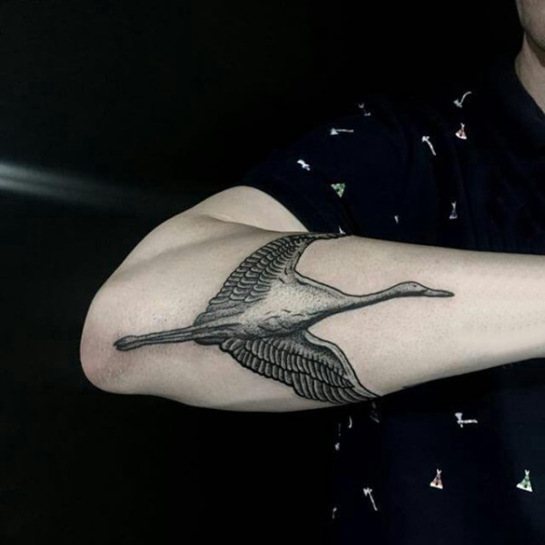 男生手臂上黑灰点刺简单线条小动物白鹤纹身图片