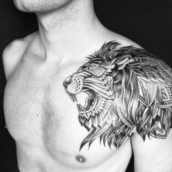 男生肩部黑色点刺抽象线条小动物狮子纹身图片