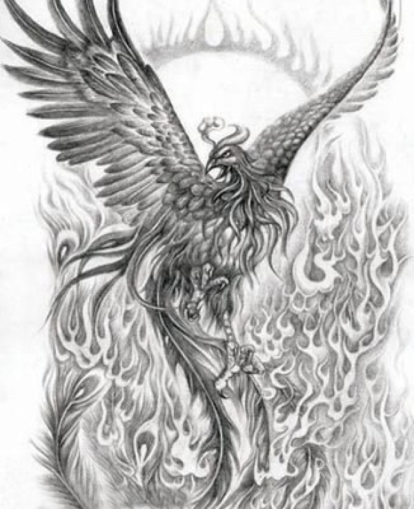 黑灰素描创意霸气火焰展翅凤凰纹身手稿