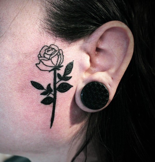 女生脸侧黑色简单线条植物玫瑰纹身图片