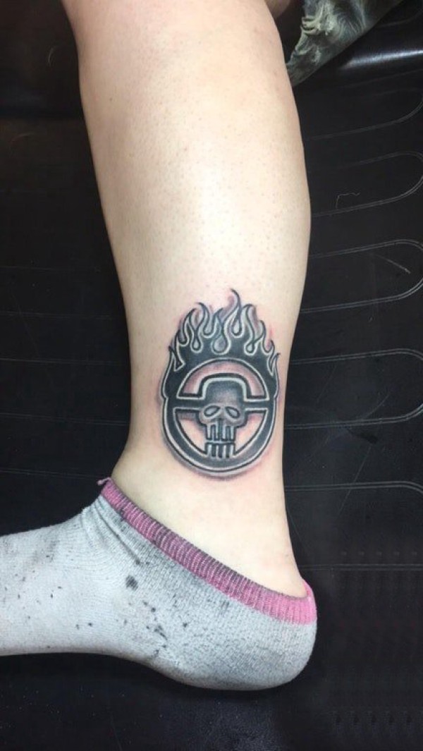 男生小腿上黑灰素描创意骷髅标志纹身图片