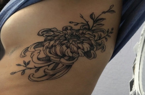 女生侧腰上黑色点刺简单抽象线条植物菊花纹身图片