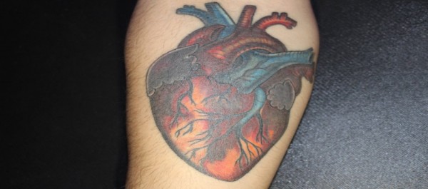 男生小腿上彩绘渐变抽象线条心脏纹身图片