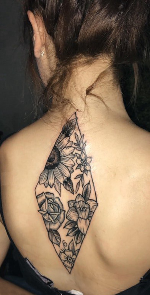 女生后背上黑色点刺几何简单线条植物花朵纹身图片