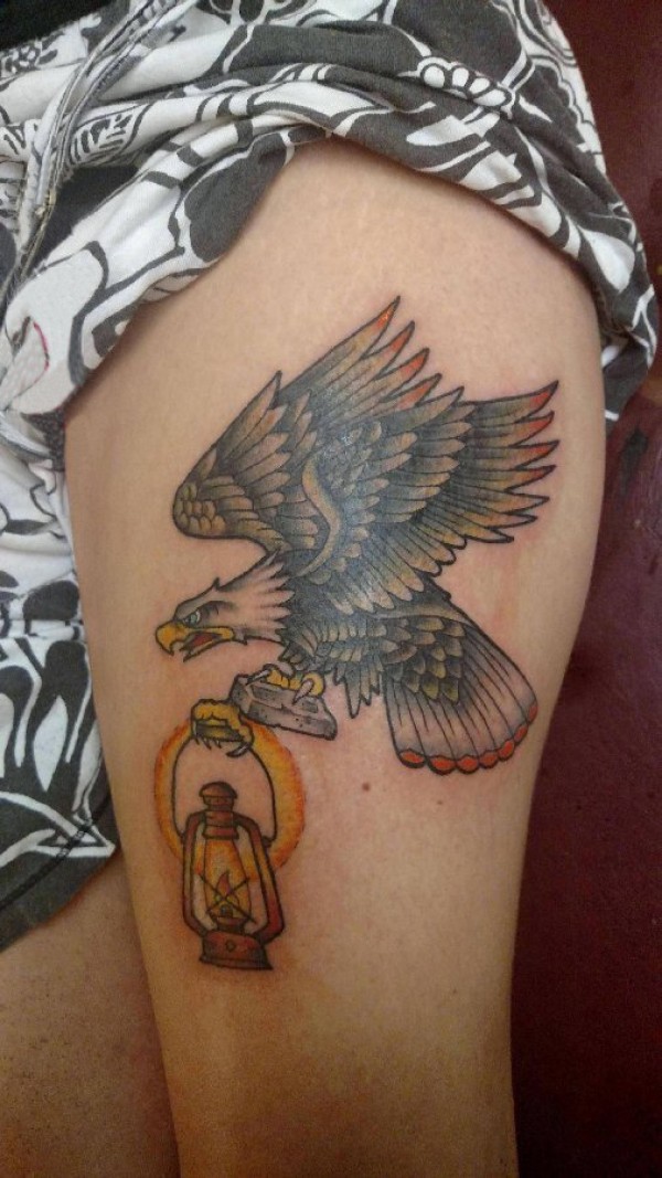 女生大腿上黑灰素描点刺技巧创意霸气老鹰纹身图片