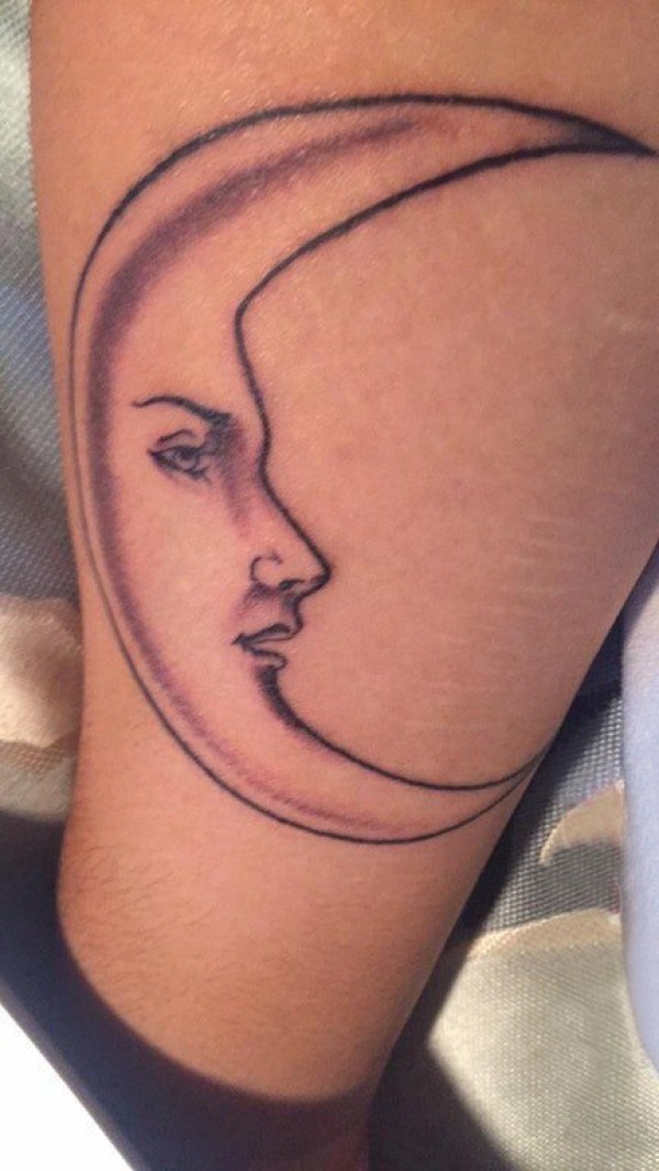 男生小腿上黑色点刺简单线条创意月亮纹身图片