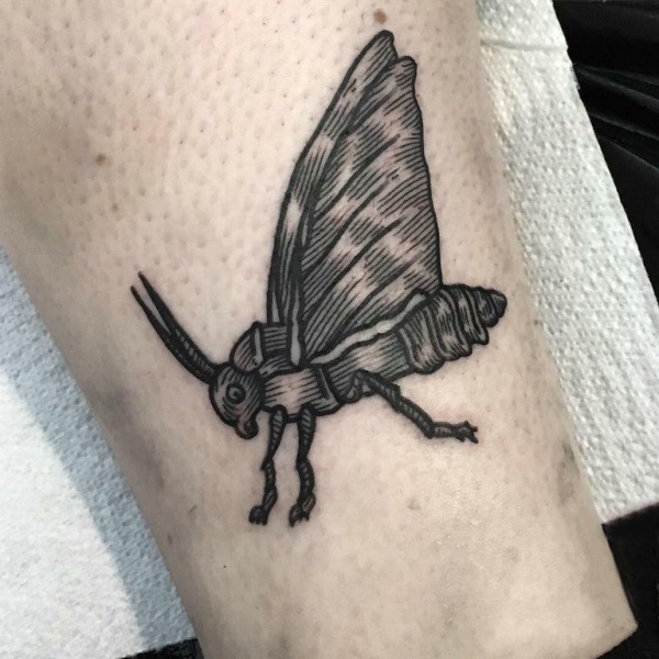男生小腿上黑灰素描点刺技巧创意昆虫纹身图片