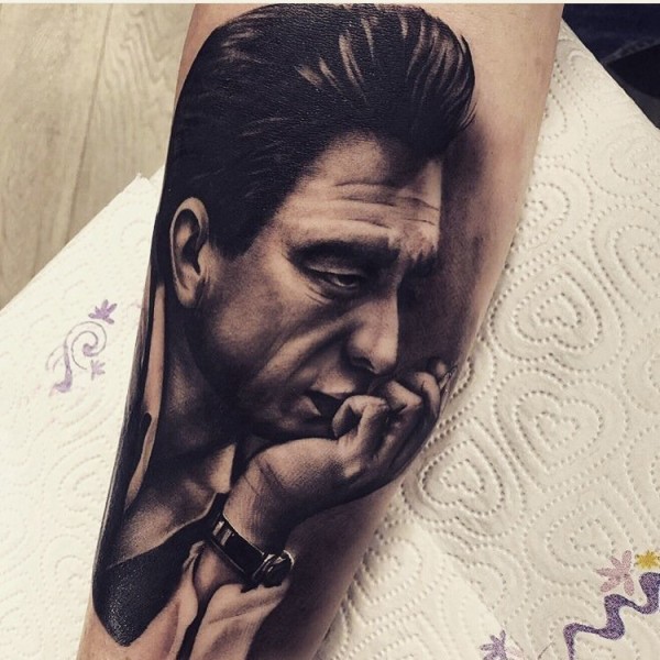 男生手臂上黑灰素描点刺技巧肖像纹身图片