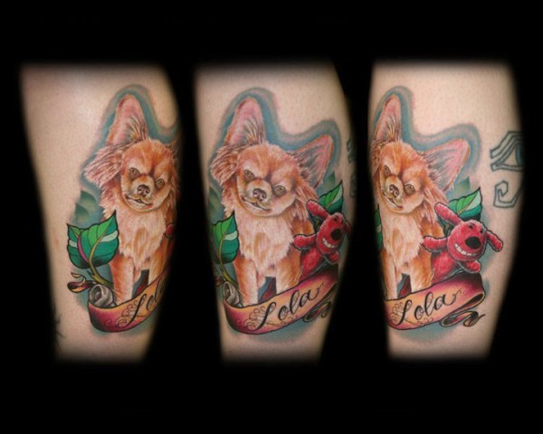 女生小腿上彩绘渐变简单线条叶子和小动物狗纹身图片