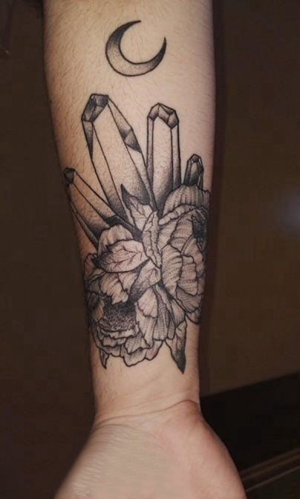 男生手臂上黑色点刺几何简单线条晶石和花朵纹身图片