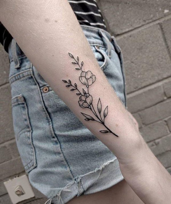 女生手臂上黑灰点刺简单线条小清新植物花朵纹身图片