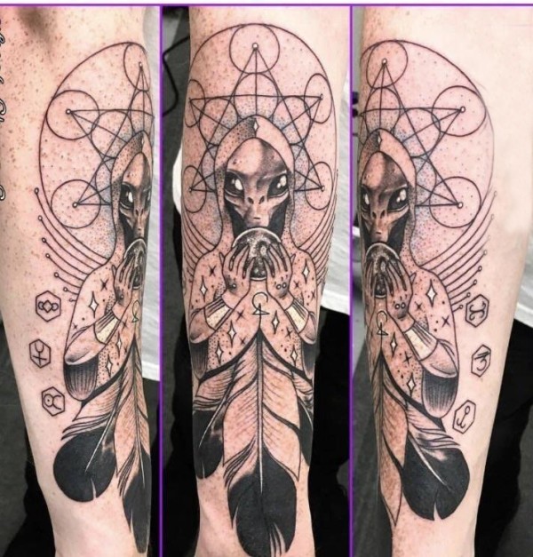 男生手臂上黑灰点刺几何线条羽毛和外星人纹身图片